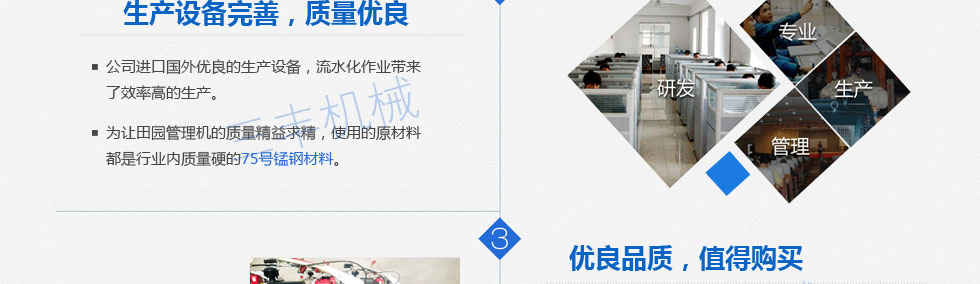 公司堅(jiān)持綠色環(huán)保、智能制造的目標(biāo)定位,大力弘揚(yáng)工匠精神,微耕機(jī) 以具有豐富實(shí)踐經(jīng)驗(yàn)的高級(jí)工程師為主體的技術(shù)管理隊(duì)伍。